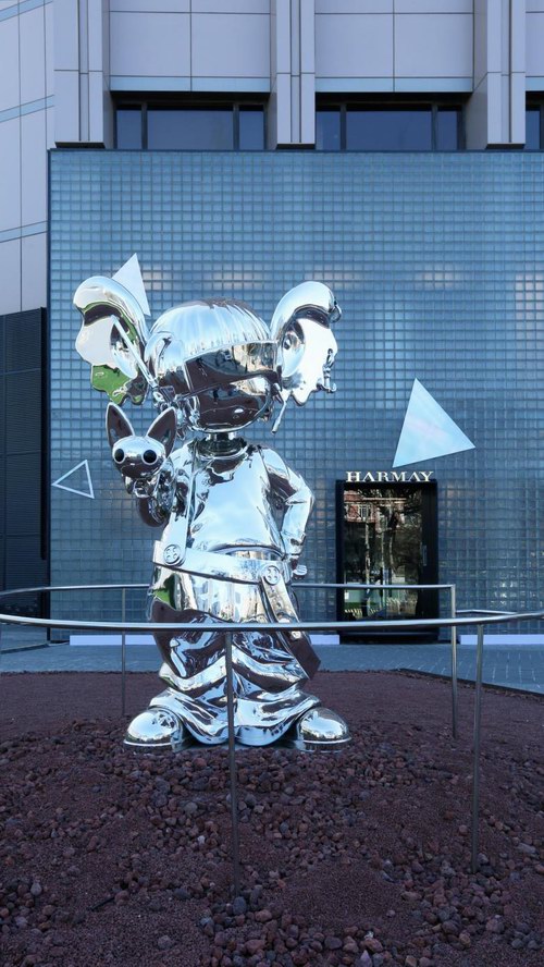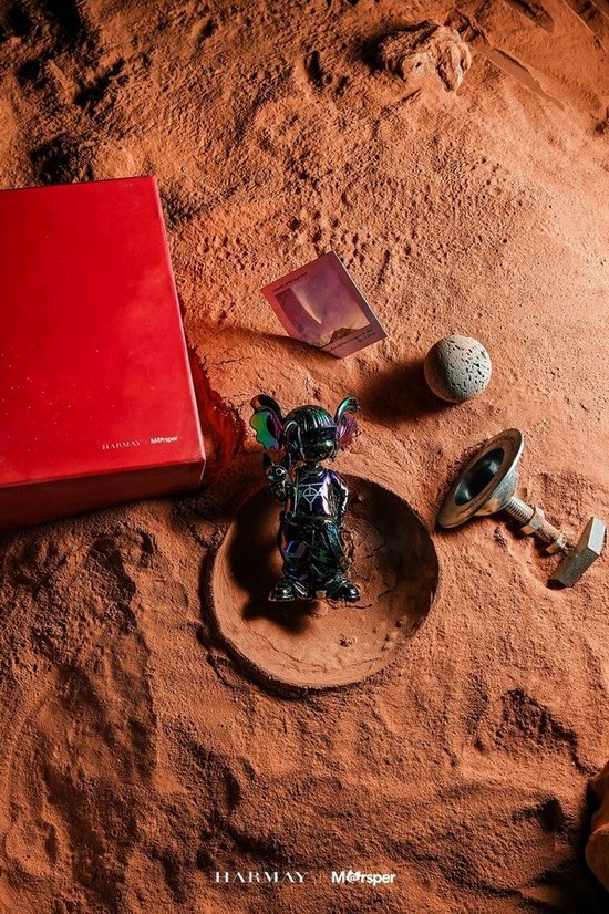 在一旁守护这颗种子的则是此次展览的主角—— Marsper,它由太空银色的玻璃钢材打造,尽职尽责地履行着守护的任务。在它脚下,是由红色的砂石颗粒、岩石和泥沙组成的广袤火星地表,踏上地表的瞬间就如同漫步在火星表面。走进HARMAY話梅店内,限量星空版Marsper在水泥色墙面的衬托下格外迷人,绚烂的彩色星光仿佛为它披上了一件华丽的外衣。