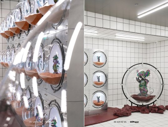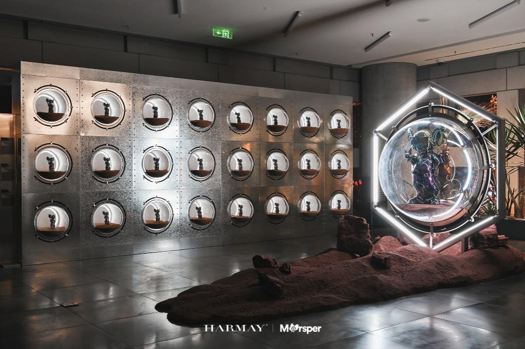 当时间、空间的维度被打破,火星元素与HARMAY話梅简洁而不失质感的工业风格相碰撞,便格外抓人眼球。室内设计灵活运用金属、不锈钢、玻璃、荧光灯等元素,Marsper则驻扎在火星土壤上,以矩阵“培养舱”的装置陈列形式呈现。在透明舱体内,每一只Marsper都有着自己的专属编号,守护美好与希望。