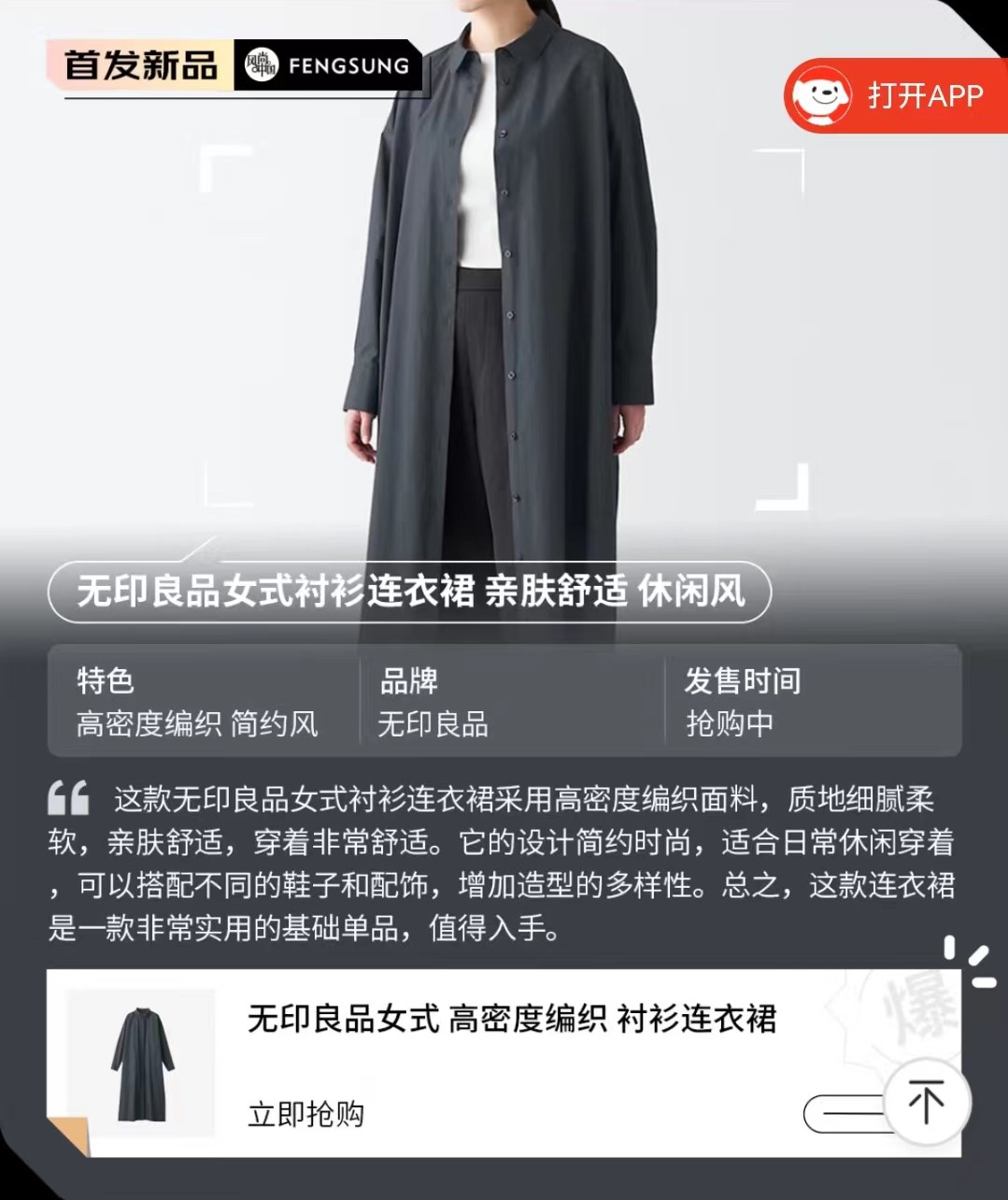 这款无印良品女式衬衫连衣裙采用高密度编织面料,质地细腻柔软,亲肤舒适,穿着非常舒适。它的设计简约时尚,适合日常休闲穿着,可以搭配不同的鞋子和配饰,增加造型的多样性。总之,这款连衣裙是一款非常实用的基础单品,值得入手。